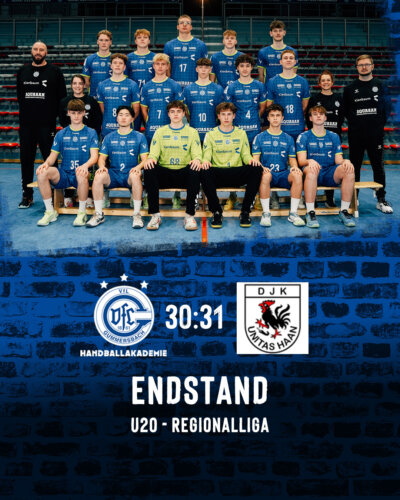 Gestern Abend hat die U20 der Handballakademie des VfL Gummersbach ihr siebtes Pflichtspiel der laufenden Saison 2025/26 in der Regionalliga Nordrhein absolviert. Gegen die DJK Unitas Haan mussten sich die Jungs nach einer spannenden Partie vor heimischer Kulisse denkbar knapp mit einem Tor geschlagen geben.